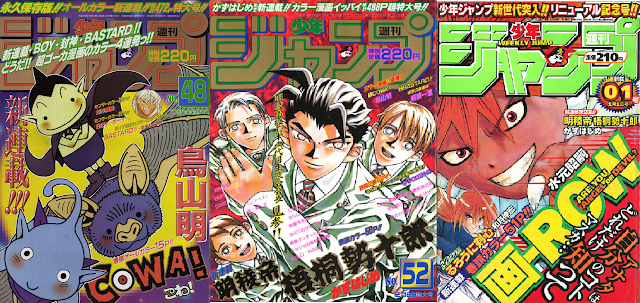 O que deixou a situação muito pior foi o fato de Rokudenashi Blues e Captain Tsubasa também estarem chegando ao seu final, os dois tinham tudo para acabar no ano de 1997 – Por mais que eles não chegassem ao tamanho de Dragon Ball, ajudavam no máximo possível a manter a popularidade da revista, principalmente Captain Tsubasa que era amado pelos japoneses. Para frear essa queda, as primeira estratégia dos editores foi justamente trazer “de volta” um dos seus mangás mais populares. Bastard que já estava sofrendo com uma grande inconstância foi relançado na Weekly Shonen Jump. A série vinha sendo lançada na Seasonal Shonen Jump (Praticamente um Jump NEXT da época), porém, como a situação da revista estava bem série, mesmo sabendo que o autor não tinha condições de lançar constantemente o mangá na revista, decidiram traze-lo de volta. A outra estratégia foi estrear Tokimecha, uma mini-série de três capítulos do Akira Toriyama que serviu para fazer algumas pessoas comprarem a revista e quem sabe ler outros mangás, gostarem desses mangás e assim voltarem a comprar semanalmente a Shonen Jump. Algumas edições após trazerem Bastard e Tokimecha, já na número #10 do ano, lançaram a primeira leva do ano, com três mangás: