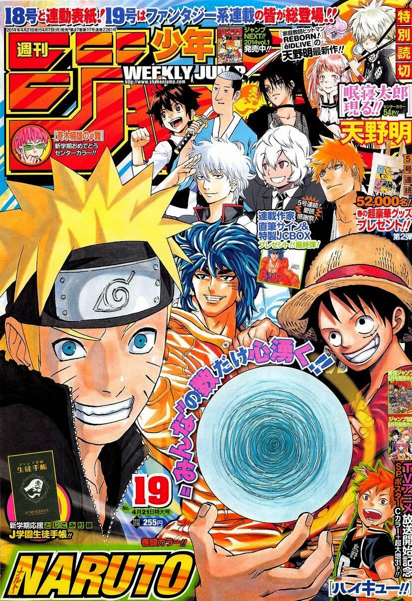 Começamos a revista com uma bela página colorida de Naruto, junto com os outros personagens de ficção da Weekly Shonen Jump (Na semana passada tivemos uma capa de Haikyuu comandando todos os personagens que tem seu universo no mundo real).
