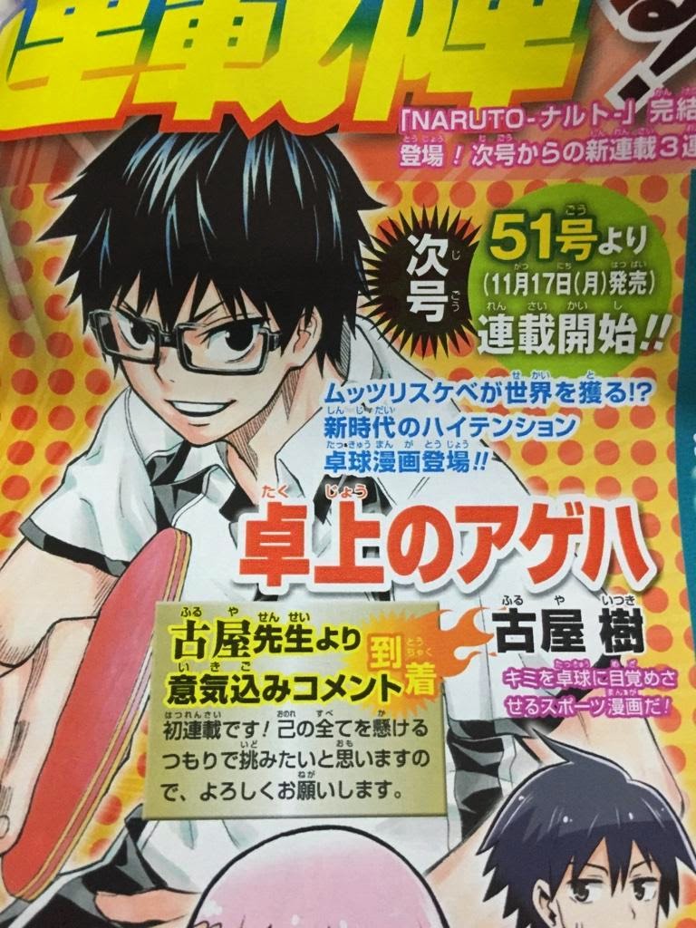 Caso tu queira ler o One Shot, clique aqui. Takujo no Ageha é mais um mangá de esporte chegando a revista, a Shonen Jump esta apostando muito em mangás do gênero, pois esta vendo um grandíssimo potencial no estilo – Ageha trata de um esporte bem famoso no oriente, mesmo que seja praticado mais por diversão, o Ping Pong.