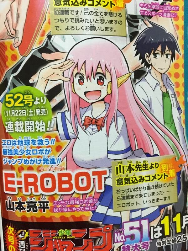 E-Robot é um mangá de Ecchi bem pesadinho com uma alta dose de humor que promete ocupar a vaga que To Love Ru deixou em aberto a muitos anos atrás, o mangá foi o vencedor da Jump NEXT de Verão de 2013, isso significa que o mangá foi lançado em Julho do ano passado, foram 1 ano e 4 meses trabalhando na série.. Na 2ch o mangá foi considerado simplesmente mediano, mas para o público em geral foi o melhor mangá da edição, por isso podemos esperar posições não tão boas por parte da 2ch em relação a E-Robot, que se pronuncia Eru-Robot.