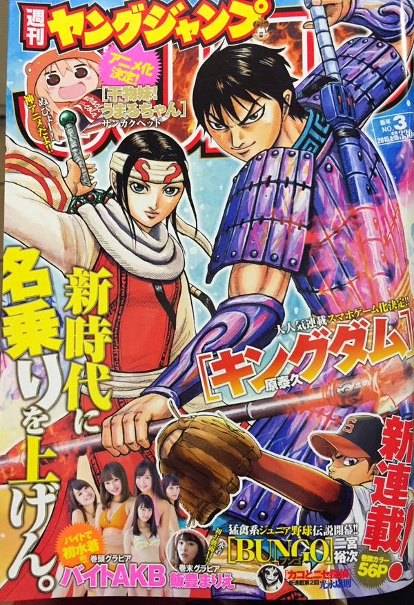 Em primeiro lugar na classificação temos Kingdom, o que não é uma novidade para ninguém, o mangá quase sempre abre a classificação da revista, esta para nascer a obra que conseguirá substituir Kingdom na Young Jump – Em segundo temos Bungo, o mangá de Baseball, que estreou na edição passada, esta sua posição foi totalmente decidida pelos editores, sem ter influência da opinião do público… Lembrando que na Young Jump o público vota nos mangás, só que o resultado da votação nunca é revelado, deste modo os editores sabem quais mangás estão sendo bem aceitos, quais não.