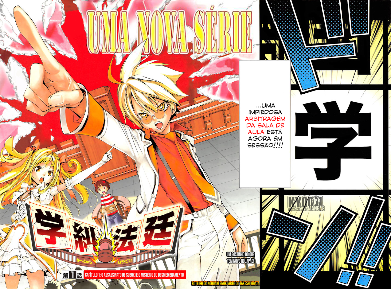 Escrito por Enoki Nobuaki e ilustrado por Takeshi Obata, Gakkyuu Houtei é a terceira e última estréia desta nova leva da Weekly Shonen Jump. O mangá foi disputado por muitas scans, mas a primeira a traze-lo em português e com uma altíssima qualidade foi a Kyodai Scans, a mesma que já traduziu Takujou no Ageha, caso vocês queiram ler o primeiro capítulo antes de ler a minha análise, clique aqui.