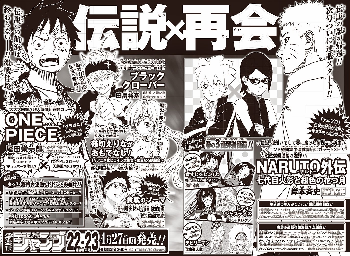 Isso mesmo “boyz”, já teremos mais uma nova leva vindo aí, desta vez com três novas séries e uma mini-série de Naruto – Como eu já havia dito a nova “leva” chegaria em Maio, porém de nenhum modo eu esperava que fosse estrear 3 novas séries, isso é uma quantidade bem surpreendente para mim – Infelizmente isso significa que ao menos três séries serão canceladas, provavelmente Gakkyuu Houtei, Roggy e Takujou no Ageha. O cancelamento de Houtei e Ageha já eram esperado, mas não deixo de ficar surpreso pelo cancelamento precoce de Roggy.
