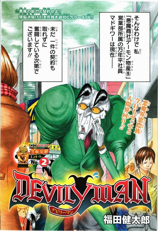 Devily-man (Kentarou Fukuda): One Shot vencedor da Golden Future Cup de 2014, é um mangá de investigação, onde um garoto junto com seu amigo demônio participam de uma organização secreta que investiga acontecimentos sobrenaturais, é uma legitima obra de investigação (Diferente de Kagamigami que tem elementos de investigação, porém é um B-Shounen mesmo). O One Shot tem um bom clima de comédia e ao mesmo tempo, um clima bem bizarro relacionado ao sobrenatural, o autor conseguiu unir bem os dois elementos. Vamos torcer para que Devily-man quebra a maldição da Golden Future Cup.
