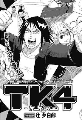 TK4 é um mangá louco, simplesmente louco, mas que me agradou muito. TK4 fala sobre um delinquente que batia em todo mundo no colégio, até quando foi comido por um monstro – Esse monstros logo após foi capturado por uma organização que combate esses monstros… O detalhe é que Takeshi, o delinquente, ainda estava vivo dentro do monstro, mesmo que de forma incompleta (Somente o seu cérebro sobrou). Deste modo a cientista que comanda essa organização decide remontar o corpo de Takeshi utilizando parte roboticas, transformando-o em um robô que será usado para caçar outros monstros – Teste foi um sucesso, TK4 se tornou uma fantástica arma de guerra. Mas de repente, a cidade é ataca por um monstro gigantesco, deste modo, a cientista deve ativar o modo “megazord” de Takeshi, transformando-o em um robô gigante que consegue finalmente vencer o inimigo.