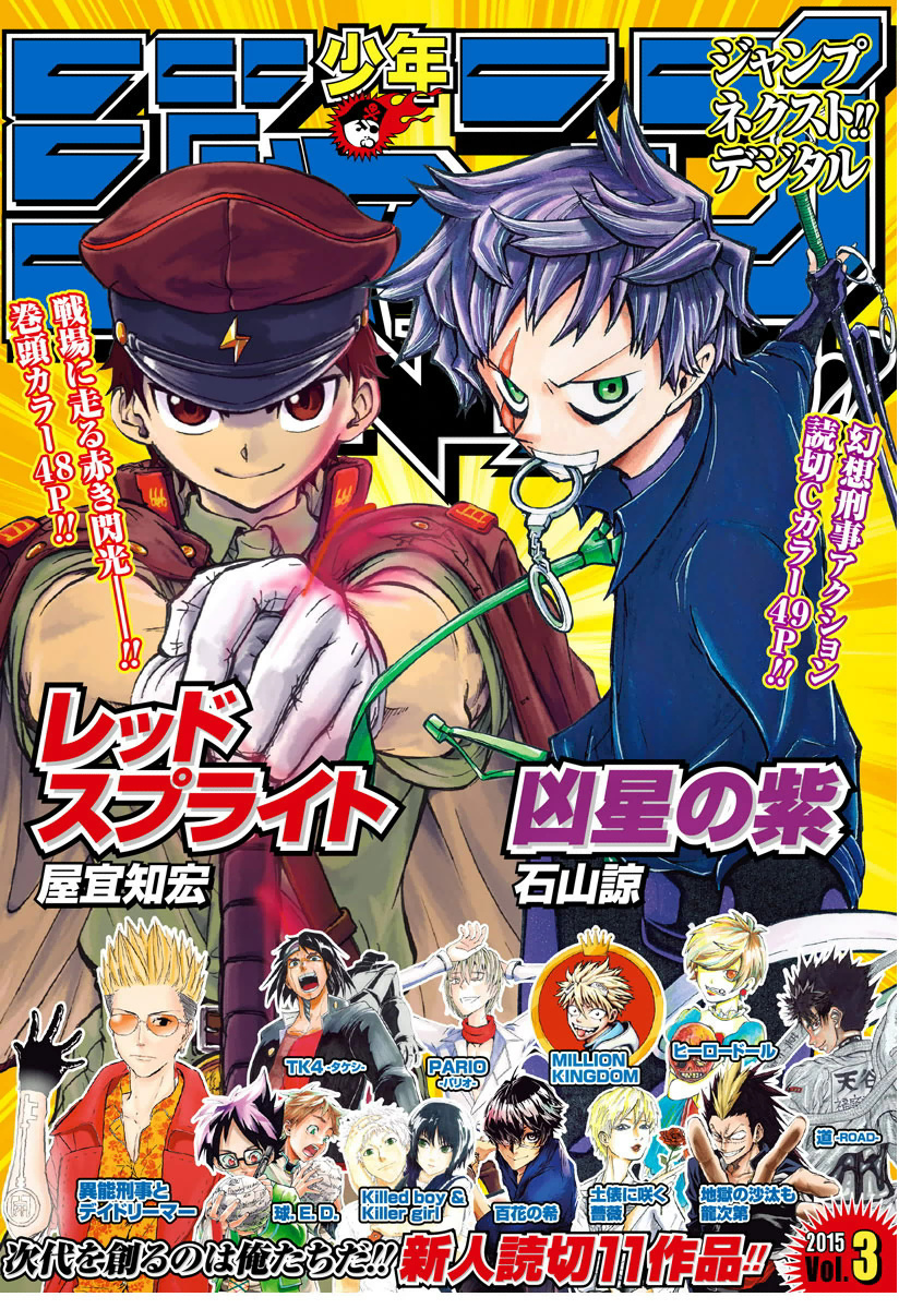 O primeiro mangá a ser analisado é Red Sprites de Tomohiro Yagi, criador de Iron Knight, mangá lançado em 2013 e que foi cancelado com 3 volumes lançados – Red Sprites conta a história de mundo distópico onde as máquinas o governo contra a população através das máquinas (Mesmo o mundo tem uma origem diversa, o design das máquinas e a ambientação lembra bastante Jumbor). Nesse mundo tem um garoto que é um soldado, no One Shot, ele e seus companheiros presenciam a cena de várias máquinas matando vários dos seus colegas e ficam chocados. Logo após, um general (Que usa vermelho, mas como o mangá é preto e branco, a sua roupa é totalmente preta, lembrando os nazistas) aparece e leva os soldados até uma armadilha, onde são presos e realizam um experimento cientifico neles, que dá ao soldado super poderes. Logo após, o general ordena que os soldados ataquem o garoto, para testar a força deles e ele consegue aguentar todas as balas e vencer os inimigos. Como o experimento deu certo, o principal foi promovido para também ser um general e se tornar uma das principais armas do exercito – Mas antes de ajudar a sua nação, se vinga do general que fez esse experimento, o matando.