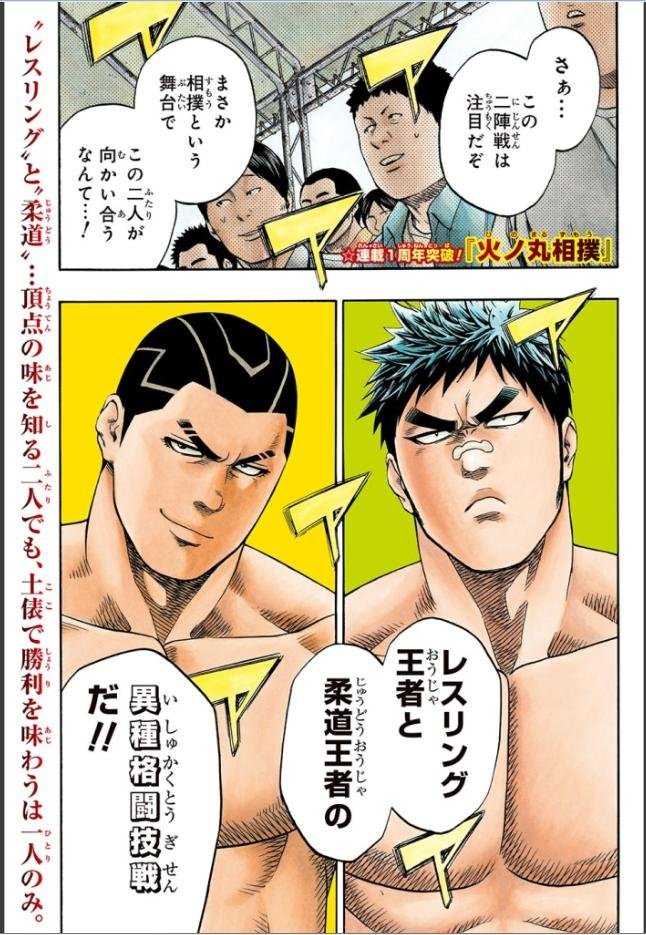 Vamos começar com os mangás que não entraram no Dohyo (Na arena) nessa edição – O primeiro é justamente Hinomaru Zumou que ganhou sua capa e página colorida de abertura de aniversário, o mangá finalmente conseguiu completar 1 ano de vida (Na verdade completou na edição #26, mas só estamos comemorando agora), um grande feito para qualquer obra – Ainda é cedo para falar sobre anime de Zumou, mas quem sabe no aniversário do próximo ano já não possamos ter alguma notícia relacionada a obra.