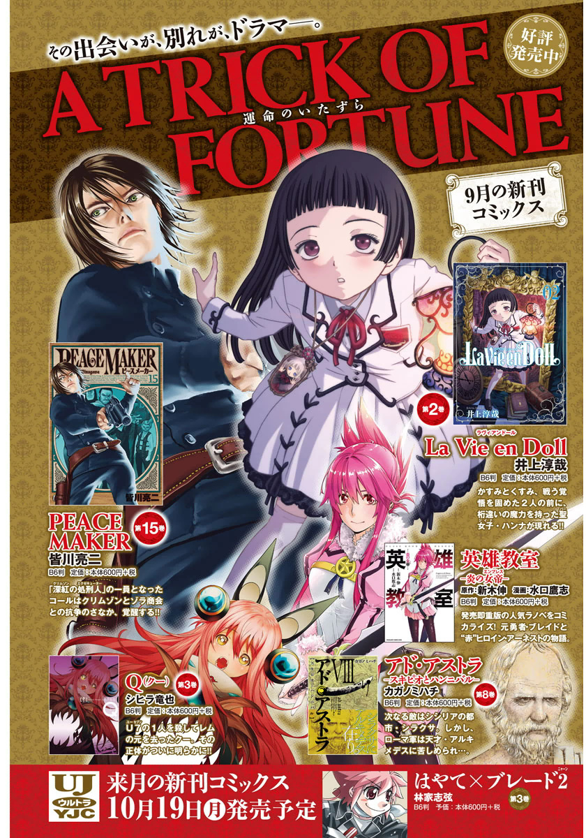 Começando pelos mangás não ranqueados, nesta edição finalmente tivemos a tão esperada “capa” para Peace Maker – Muitos pensam que o segundo mangá de maior sucesso da Ultra Jump é Biorg Trinitiy, porém quem garante esse título é justamente Peace Maker. Por isso nada mais que justo o mangá receber ao menos uma capa por ano, já que Biorg Trinity que vende menos recebe em média 3 capas em somente um ano. Para quem não sabe, Peace Maker é uma obra de fantasia que junta poderes mágicos em um mundo de faroeste – E por mais que a ideia da série pareça de uma obra de “B-Shounen”, a obra é Seinen e tem várias reflexões muito interessantes sobre a vida. Com certeza vale a pena ler.