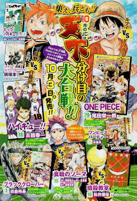 Volumes da Shonen Jump que serão lançados dia 03/10: One Piece [79], Haikyuu!! [18], Ansatsu Kyoushitsu [16], PSI Kusuo Saiki [15], Shokugeki no Souma [15], Isobe Isobee Monogatari [08], Black Clover [03], Ultra Battle Satellite [03 – Final].