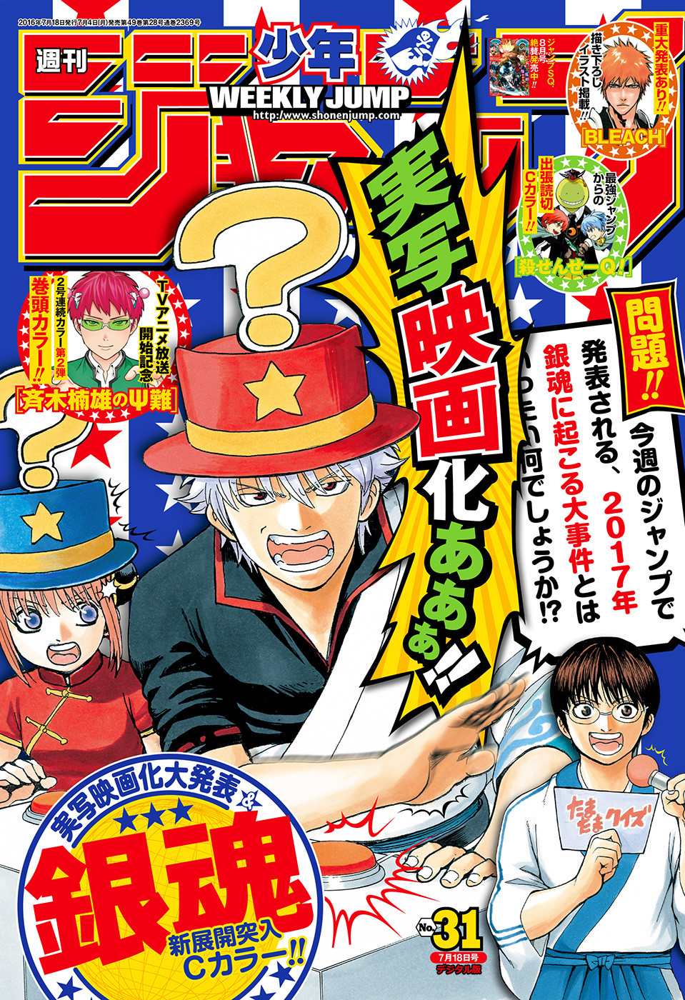 TOC Weekly Shonen Jump #31 (04/07) PSI Kusuo Saiki (Página Colorida de Abertura) 01 – Boku no Hero Academia 02 – ONE PIECE 03 – Black Clover 04 – HUNTER X HUNTER (Entrando em Hiatus de novo) Gintama (Capa,Página Colorida e Anúncio de Live Action para 2017) 05 – Haikyuu!! 06 – Shokugeki no Souma Koro-Sensei Quest (Página Colorida) 07 – Hinomaru Zumou 08 – Yuragi-Sou no Yuna-san 09 – Kimetsu no Yaiba 10 – Samon-Kun wa Summoner 11 – Takuan to Batsu no Nichijou Enma-Chan (Primeiro Rank) BLEACH (Página Colorida) 12 – Sesuji wo Pin! to 13 – World Trigger 14 – Kochikame 15 – Mononofu 16 – Nisekoi 17 – Toriko Isobe Isobee Monogatari