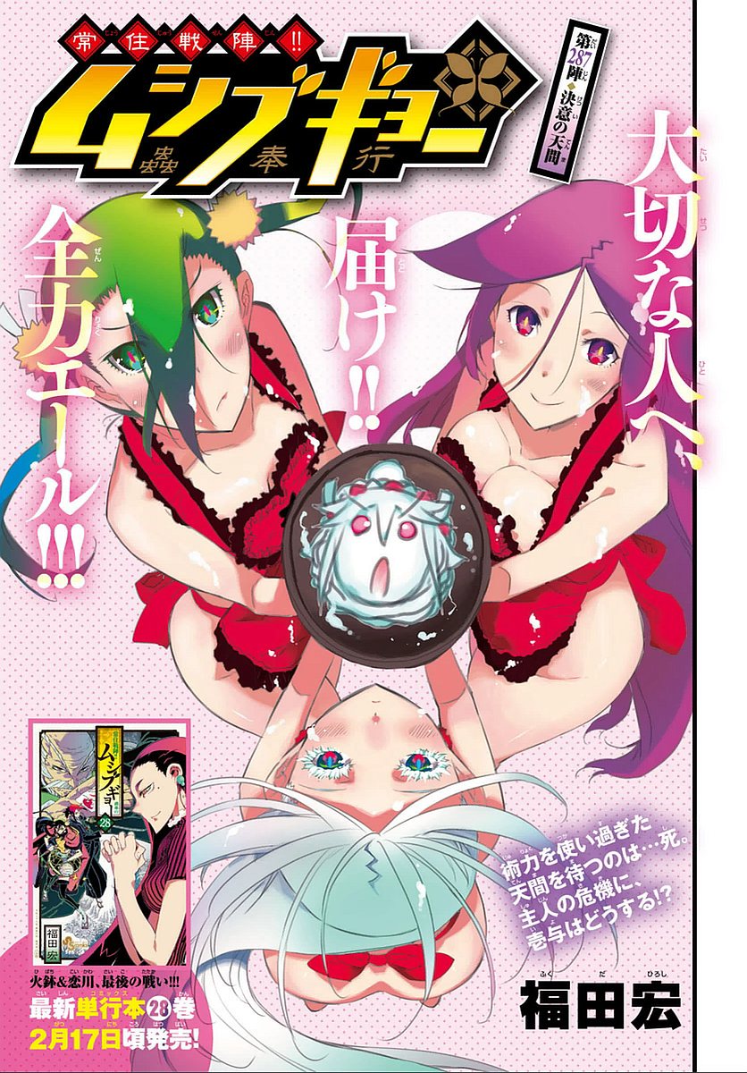 As outras páginas coloridas foram para Be Blues! ~ Ao ni Nare, veterano que já está ficando cada vez mais próximo da marca de 300 capítulos e que já passou da hora de receber uma adaptação em anime, e para Joujuu Senjin!! Mushibugyo, que embora tenha sofrido uma queda nas vendas e na popularidade, ainda tem um bom apoio dos editores. Isso não impede que Mushibugyo fique no limbo do esquecimento, mas permite que o autor dê continuidade à obra pelo tempo que considerar necessário.