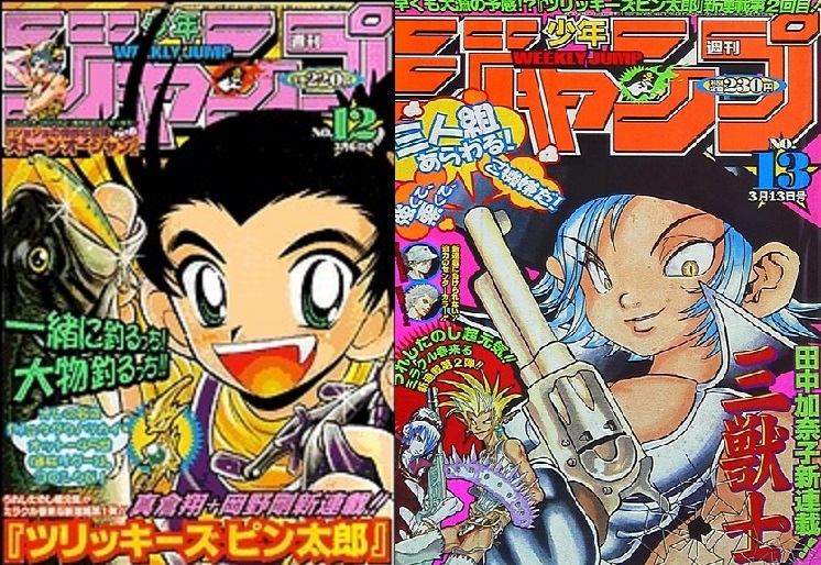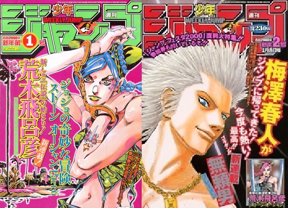 Os dois mangás que ocuparam essas duas vagas foram duas apostas seguríssimas. A primeira era o retorno de “JoJo” para a revista. Após ser encerrada a sua quinta parte, Hirohiko Araki decidiu dar uma pequena pausa na série, e usou esses meses de “hiatos” para idealizar a sexta parte e também descansar. Assim, na primeira edição do ano 2000, o mangaká voltou a dar as caras na revista, trazendo a sexta parte da série que o levou ao sucesso mundial. Para quem não sabe, antes do encerramento da quinta parte, “JoJo” tinha um papel muito parecido com o de “BLEACH” na revista – restava sempre nas posições inferiores, mas em nenhum momento corria risco de ser cancelado, pois, era muito bem aceito pelos leitores e tinha todo o apoio editorial. Quando lançaram essa sexta parte, os editores se viram com a necessidade de dar um grande destaque à esse “recomeço” da série, deste modo, nas primeiras sete semanas vimos o mangá conquistando boas colocações, estando sempre nos dez primeiros colocados (utilizando o ranking japonês), por isso, na primeira metade da revista. Essa fase foi encerrada com uma bela página colorida de abertura no seu sétimo capítulo (nesse ano foi muito comum um mangá receber capa, e um outro ser a página colorida de abertura).