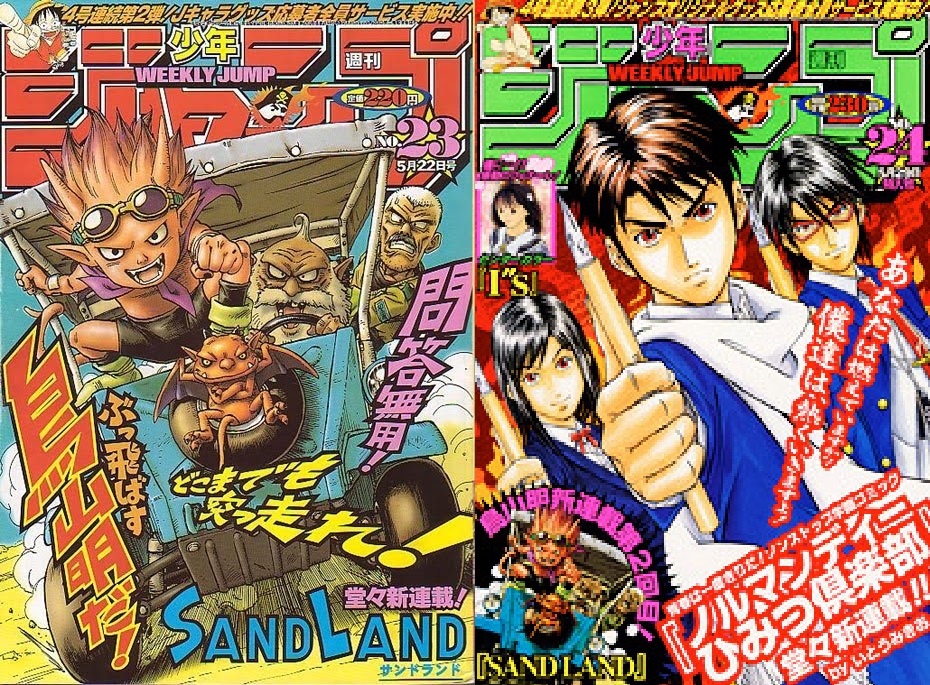 O primeiro mangá a estrear nessa leva, não foi nada mais e nada menos, que uma mini-série do gênio Akira Toriyama, “Sand Land” – após o encerramento de “Dragon Ball” (42 Volumes, 1984-1995), o autor decidiu que iria lançar somente mini-séries, que de certo modo lembravam a primeira fase de “Dragon Ball” (pois, o autor mesmo declarou que gostou mais de escrever a primeira parte, do que a segunda parte, que conhecemos como “Dragon Ball Z”). a primeira mini série foi “Cowa!” (1 Volume, 1997-1998) e a segunda foi “Kajika” (1 Volume, 1998), comentei sobre ambas nas análises do ano de 1997 e 1998. A terceira e última mini-série do autor na revista foi “Sand Land” (por mais que “Jaco!” seja uma mini-série, não colocamos no mesmo grupo dessas três por causa de ter sido lançado em uma outra época da revista). Essa última mini-série durou quatorze capítulos e contou a história de um mundo, no qual boa parte do povo passa fome e sede, deste modo o “trio” protagonista sai em busca de uma “nascente fantasma” para poder salvar o seu povo. A história tem muitas influências de filmes como “Mad Max” (1979) de George Miller, e inspirou “Acquaria” de Sandy e Junior (quem entendeu a referência vai ganhar um prêmio). A mini-série foi um grandíssimo sucesso, e novamente ajudou a revista a atrair os antigos leitores.