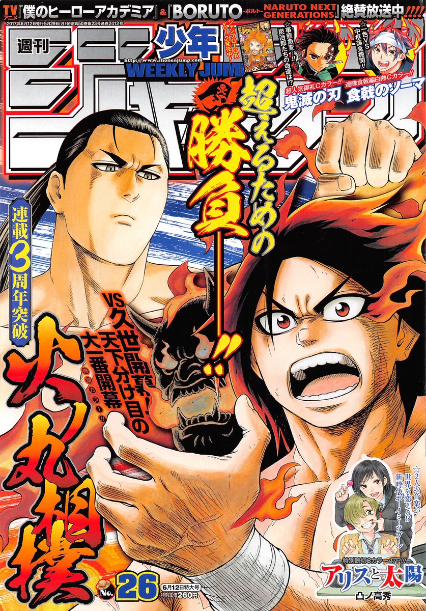Começando pelos não ranqueados, nessa edição tivemos capa e página colorida de abertura para Hinomaru Zumou, que está comemorando 3 anos de vida, e infelizmente esse pode ser o seu último aniversário, depende se o autor estar realmente encerrando mangá (vamos ser sinceros, é quase certo que está terminando). O substituto da série deve ser Hunter x Hunter que está retornando a revista – e espero que dessa vez, reste ao menos por uns 25 capítulos. Também tivemos nessa edição páginas coloridas para Kimetsu no Yaiba, Shokugeki no Souma e para o One Shot “Alice no Taiyou”, que parece ser bem interessante.