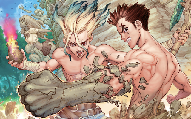 Dr.Stone conta a história de dois adolescentes que viviam suas vidas colegiais “normais” (não podemos considerar a vida de Senkuu, o segundo protagonista, tão normal assim), quando do nada, todas as criaturas vivas na terra (pássaros, seres humanos, ursos, gatos e ecc) se tornam pedra, incluindo os dois heróis da história. É como toda a sociedade tivesse se tornado uma estátua. Milhares de anos se passam, e nossos heróis conseguiram se liberar da petrificação. Contudo, logo perceberam que foram os únicos a conseguirem realizar tal feito, e todos os outros seres humanos ainda estão paralisados e cobertos de pedra. Agora, sozinho eles terão que encontrar um modo de reconstruir a humanidade e livrar os seus companheiros de espécie dessa “maldição”. O ritmo da série é bem rápido, e mesmo os primeiros capítulos não convencendo, após o capítulo 20 a série simplesmente melhorou absurdamente de qualidade (e continua a melhorar). Deste modo Dr.Stone conseguiu garantir uma vaga no TOP 30 de 2017.