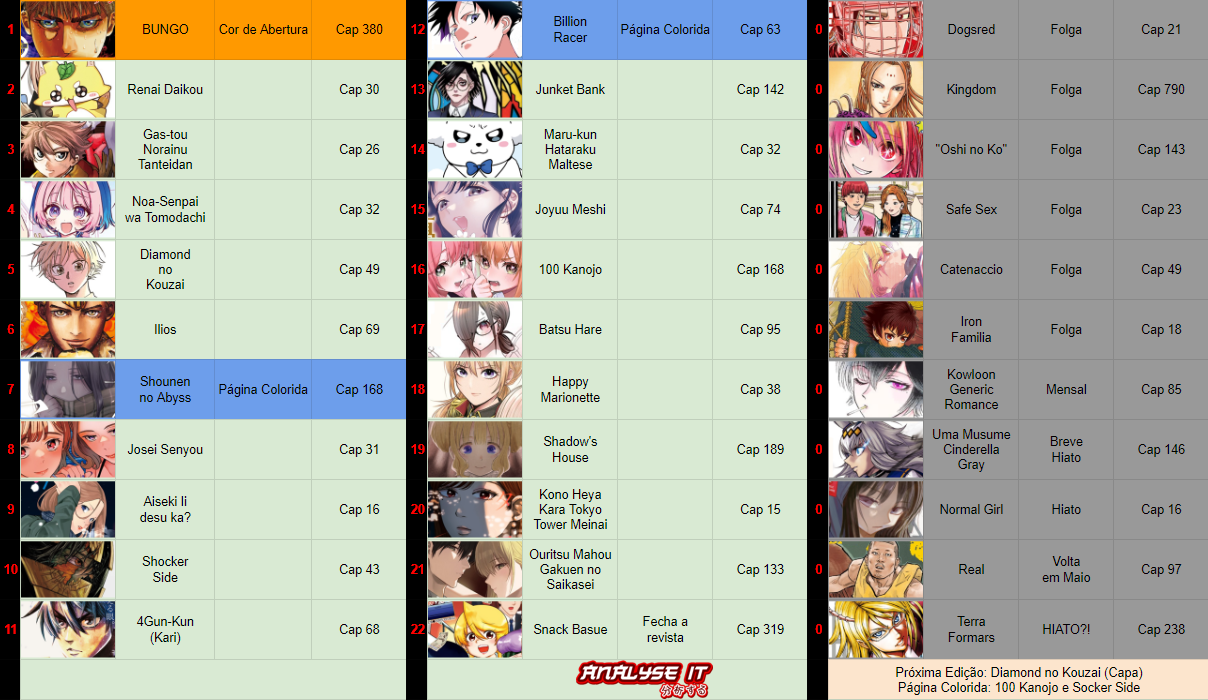 Ausentes: Dogsred c21, Kingdom c790, “Oshi no Ko” c143, Safe Sex c23, Catenaccio c49 e Iron Familia c18 de folga; Real c97 (Volta em Maio), Kowloon Generic Romance c85 (Mensal), Terra Formars (Hiato), Normal Girl c16 (Hiato), Uma Musume: Cinderella Gray c146 (Breve Hiato)