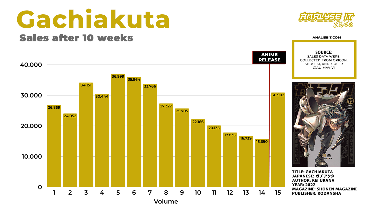Contudo, o que parecia ser um crescimento contínuo acabou se tornando uma montanha-russa até atingir o ápice no volume 5, que vendeu cerca de 37 mil cópias. Um aumento de aproximadamente 37% do seu público. Um resultado positivo, que colocava Gachiakuta entre os dez títulos mais vendidos da Magazine e no TOP 500 do mercado geral. Mas esse pico já revelava um problema: por algum motivo, a série não conseguia viralizar no Japão.