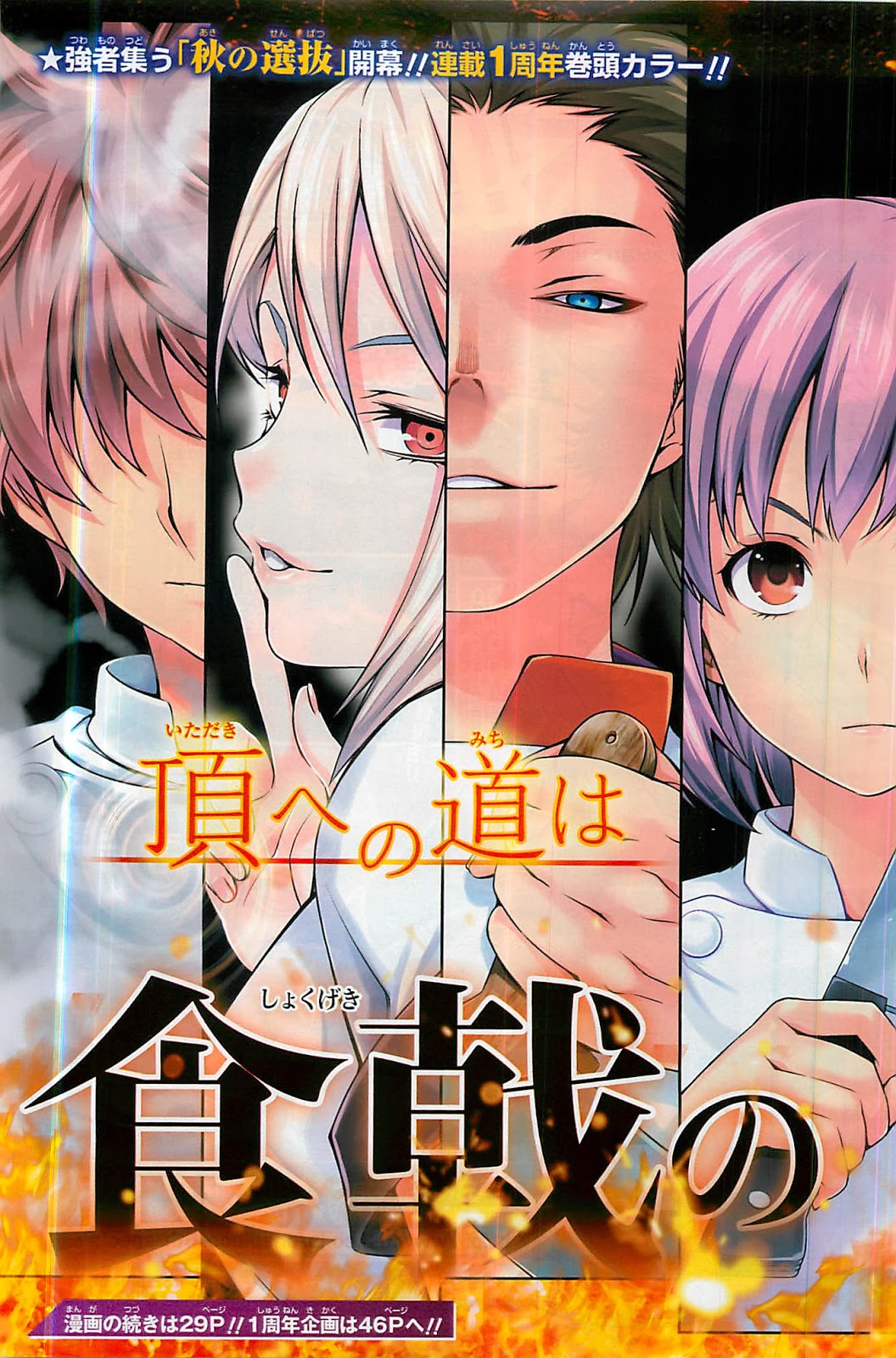 Primeiramente gostaria de dizer que a capa e as páginas coloridas de Shokugeki no Souma foram bem bonitas, e fez jus a qualidade do capítulo. Tivemos um capítulo cheio de emoção, mostrando alguns dos cozinheiros da competição fazendo suas receitas… Todos que ali pareceram já eram conhecidos nossos, aumentando nossa torcida para cada um!