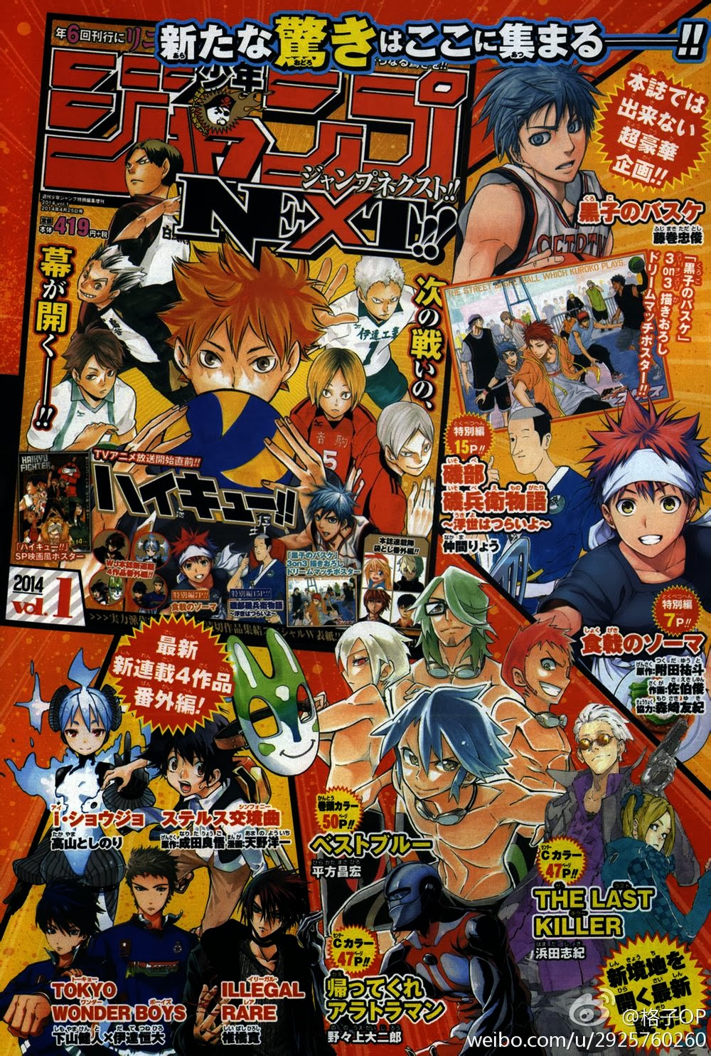 Issue #16 WSJ Cast (Cover) 00 – One Piece (Lead Color Page) 01 – Naruto 02 – Shokugeki no Soma (23 pg.) 03 – Assassination Classroom 00 – Tokyo Wonder Boys (Sem Rank / 23 pg.) 04 – Nisekoi 05 – Isobe Isobee Monogatari 00 – Stealth Symphony (Sem Rank) 06 – Kuroko no Basket 07 – PSI Kusuo Saiki 00 – Gintama (Color Page) 08 – Haikyuu!! 09 – Toriko 00 – iShoujo (Sem Rank) 00 – Illegal Rare (Sem Rank) 10 – Soul Catcher(S) 11 – World Trigger 00 – Kochikame (Nunca é Ranqueado) 12 – Bleach 13 – Iron Knight Issue #17 Info: Cover & Lead CP: Kuroko no Basket CP: Bleach, Peach Pluck (One Shot, 47 pg.) Absent: One Piece