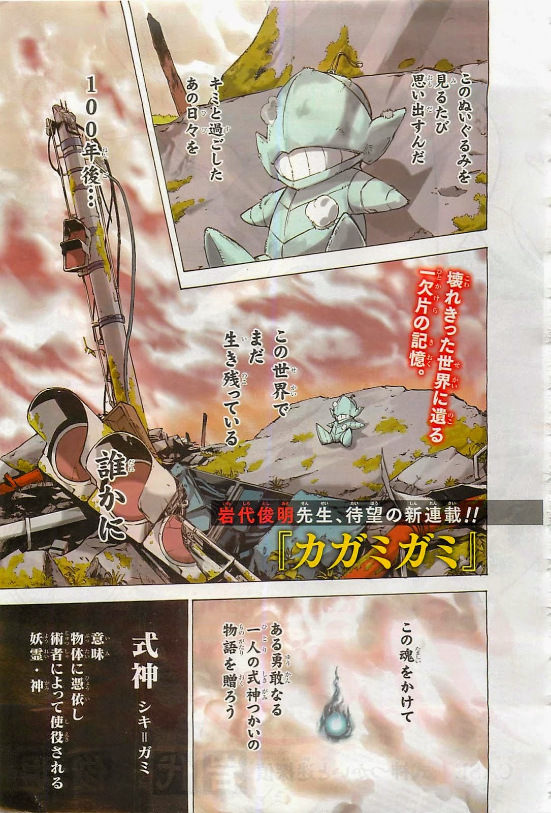 Finalmente as novas séries começaram a estrear, esta semana tivemos Kagamigami, a nova série de Toshiaki Iwashiro, criador de Psyren. Juntamente com a estréia desta nova série, tivemos também um One Shot especial vindo da Jump Plus e por fim um TOC incrível, que dá para tirar várias informações interessantes, sem mais delongas, vamos ao TOC: