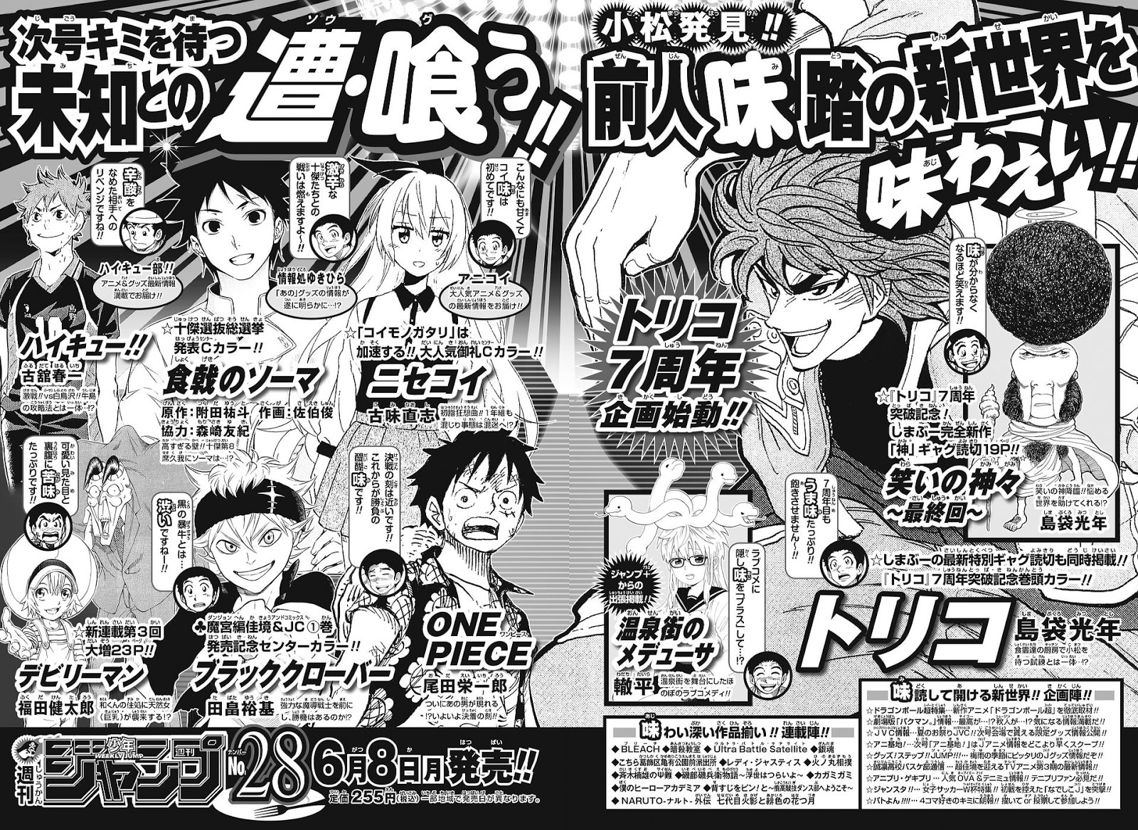 Em décimo lugar tivemos Toriko que conquistou uma péssima posição, já não bastasse estar no bottom, ficou abaixo dos spin-offs e abaixo de Lady Justice que parece estar sendo muito mal recepcionado pelo público. Assumo que eu achei que o mangá estava se estabilizando na zona intermediária, mas essa posição só comprova que Toriko ainda não se estabilizou e continua muito inconstante na classificação. Pelo menos na próxima semana a obra ganhará uma capa e página colorida de abertura em comemoração ao seu aniversário, um milagre, mas do mesmo modo que quero ver World Trigger ganhando mais páginas coloridas ainda esse ano, quero ver Toriko ganhando mais páginas coloridas, dar página colorida ou capa de aniversário é obrigação da Jump, os editores devem dar um pouco mais de espaço para essas duas obras.