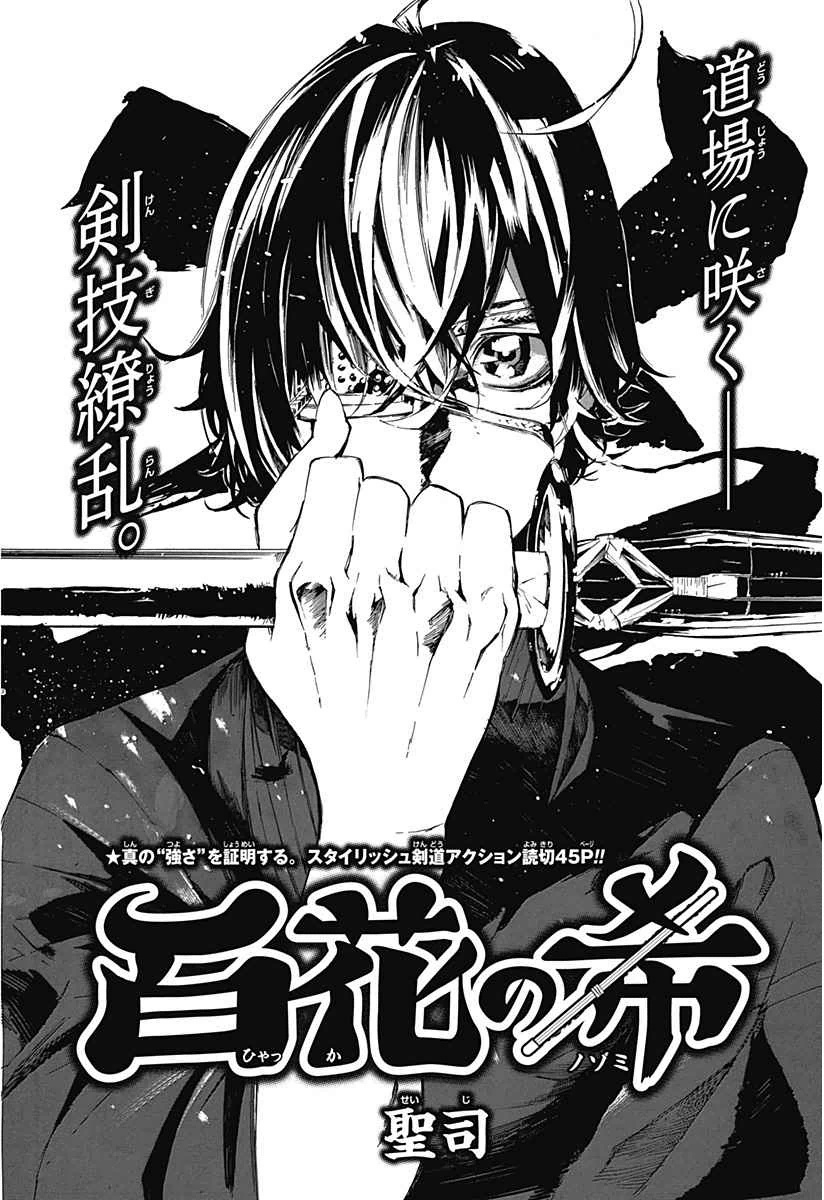 Hyakka no Nozomi é um mangá sobre Kendo – Engraçado perceber que das quatro séries até agora lançadas, três tiveram relação com esporte (Mesmo que uma delas seja focada na comédia), isso mostra como os editores estão procurando por mais um sucesso na área dos esportes, que inclusive foi um dos estilos que trouxeram mais dinheiro para a Shonen Jump nos últimos anos, com Kuroko no Basket e Haikyuu!!. Hyakka conta a história de um garoto (Que nas primeiras páginas fiquei com uma grande dúvida se era homem ou mulher) que chega na sua nova escola e vai procurar o clube de Kendo, chegando lá, o presidente do clube esnoba o personagem principal e um garoto que estava apenas começando o esporte, assim o protagonista desafia o presidente para uma batalha no dia seguinte. Na noite em questão, ele treina muito juntamente com o novato que foi humilhado e no dia seguinte luta contra o presidente, vencendo-o.