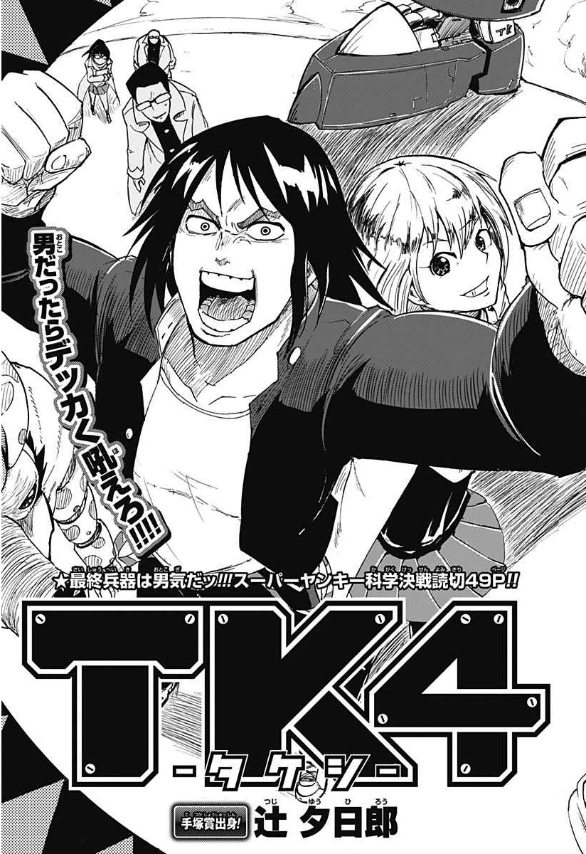 TK4 é um mangá louco, simplesmente louco, mas que me agradou muito. TK4 fala sobre um delinquente que batia em todo mundo no colégio, até quando foi comido por um monstro – Esse monstros logo após foi capturado por uma organização que combate esses monstros… O detalhe é que Takeshi, o delinquente, ainda estava vivo dentro do monstro, mesmo que de forma incompleta (Somente o seu cérebro sobrou). Deste modo a cientista que comanda essa organização decide remontar o corpo de Takeshi utilizando parte roboticas, transformando-o em um robô que será usado para caçar outros monstros – Teste foi um sucesso, TK4 se tornou uma fantástica arma de guerra. Mas de repente, a cidade é ataca por um monstro gigantesco, deste modo, a cientista deve ativar o modo “megazord” de Takeshi, transformando-o em um robô gigante que consegue finalmente vencer o inimigo.