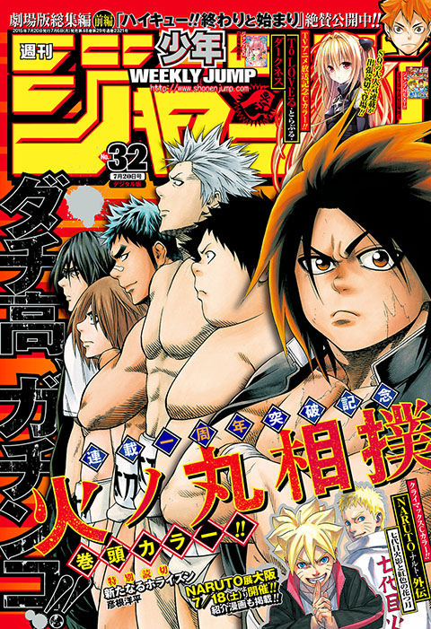Em sétimo lugar tivemos Haikyuu!!, o sumotori recebeu um Hikakê (Golpe de perna), fazendo cair no chão e perder a batalha, essa é uma das posições mais baixas do mangá nos últimos meses, não acho essa posição seja muito preocupante, principalmente após o mangá ter recebido uma capa, página colorida de aberturas e várias páginas extras… Todo os sumotoris tem uma partida que não vão tão bem assim. Os leitores não devem se preocupar, pois Haikyuu!! é muito popular, vende muito bem, está agradando os seus fãs e também o Gyoji (Juiz principal, referência ao editor da Jump). Mudando um pouco de assunto, gostaria de falar um pouco sobre o futuro de Haikyuu!!, ainda tem muita coisa para acontecer no mangá, acho que Haikyuu!! chega facilmente a 5 anos de vida, mas se durará 10 anos, acho improvável, não pela história não permitir, mas normalmente mangakás de esporte gostam de tentar novos projetos e não ficar preso somente à um esporte. Isso acontece, porque muitos, não são fanáticos por aquele esporte, mas decidiram fazer um mangá sobre aquele tema por admirarem a modalidade e também por ter mais facilmente os apoio dos editores, mas raramente o autor quando tem como projeto prioritário um mangá de esporte, normalmente imagina várias outras obras, tenta várias outras idéias, antes de apostar em um mangá esporte.