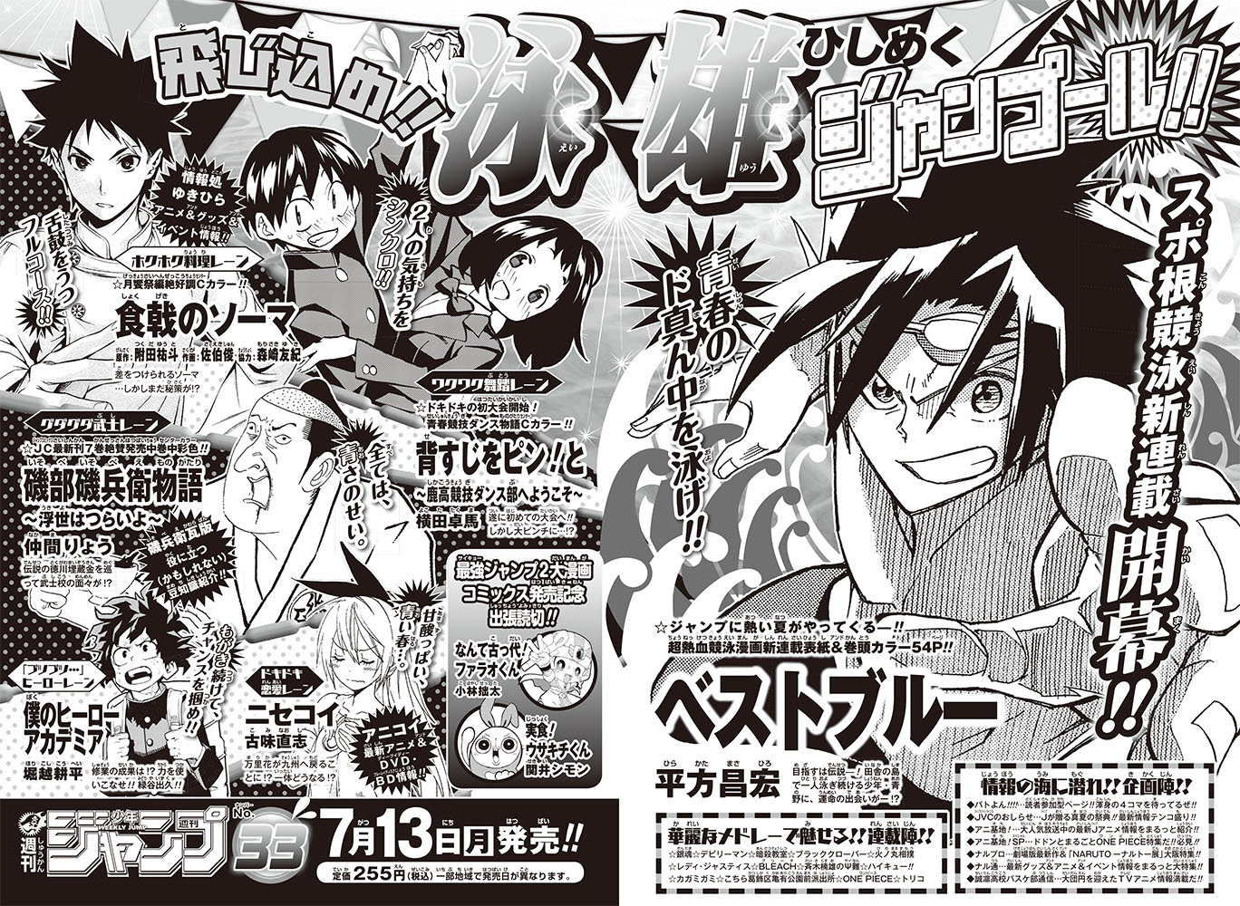 Best Blue (Estréia única): Na próxima edição teremos a estréia de Best Blue, mangá de natação do criador de Kiruko-San, mangá que estreou com Hungry Joker em Novembro de 2012 e foi cancelado juntamente com Hungry Joker. A obra era uma comédia muito simpática e que agradou vários leitores, inclusive o mangá teve um rendimento um pouco superior ao de Hungry Joker, mas como os dois foram muito mal recepcionados do inicio ao fim, foram cancelados tem cerca de 20 capítulos. Best Blue é a chance do autor mostrar que é um grande mangaká, o One Shot foi lançado na Jump NEXT! Vol.01 e foi muito bem recebido (Na análise da NEXT 02 comentei sobre o mangá), vamos ver se Best Blue vai conseguir ser o primeiro sucesso do mangaká. Tenho certeza que o autor fez muitos Daeshi’s (Treinos sem um adversário) antes mesmo de estrear na Jump e junto com seu editor tentou melhorar o máximo possível o One Shot. Comentarei mais sobre a obra na reflexão semanal direcionada ao novato, mas uma última curiosidade sobre Best Blue, com sua estréia, teremos dois mangás da NEXT 01 na Shonen Jump, Best Blue e Lady Justice. Entre na sua Shikiri (Posição de início de luta) que vai começar a sua Taichiai (Luta), Best Blue!