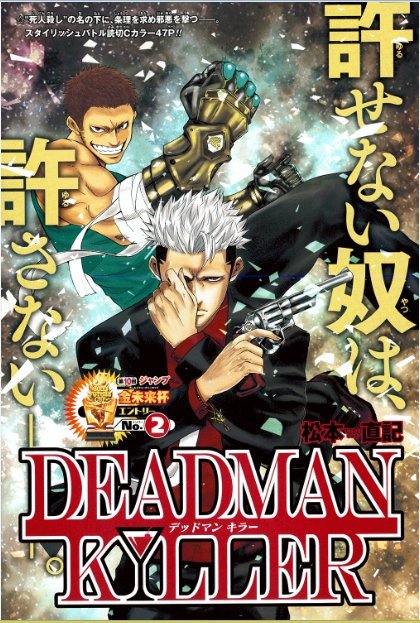 Nessa edição também tivemos página colorida para Haikyuu!!, o mangá deve ganhar a próxima capa no começo de outubro ou final de setembro quando for lançado a segunda temporada do seu anime, mas nesse período acredito que a Shonen Jump dará várias páginas coloridas para Haikyuu!!, como faz com Shokugeki no Souma e Nisekoi. O one shot dessa edição é Deadman Killer, eu comentei já sobre a primeira versão do mangá, lançada na Jump NEXT! Vol.03 de 2014… Eu havia dito que se dependesse da aceitação do público, o mangá seria serializado, mas a sua violência seria um grande problema na revista, já que o mangá é muito maduro e sangrento para o público da revista.
