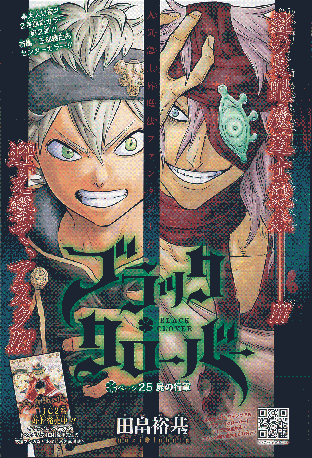 Nessa edição também tivemos página colorida para Black Clover, que continua firme e forte na revista. O mangá completou 25 capítulos nessa edição e assim finalmente superou o número de capítulo que o antigo mangá de Tabata Yuuki teve (24 Capítulos)… Parece um feito simples, mas é uma grande vitoria para qualquer autor ter uma série sobrevivendo por mais de 6 meses na Weekly Shonen Jump, já que a maioria das séries (Cerca de 81%) tendem a fracassar com menos de 4 meses de vida. Um mangá que vai precisar de sorte (Essa sorte depende diretamente da sua qualidade), é Kurama no Hirameki, o one shot da Gold Future Cup dessa edição, o mangá é sobre Kendo e parece vim ocupar a vaga deixada por Kurogane, será que vai convencer o público?
