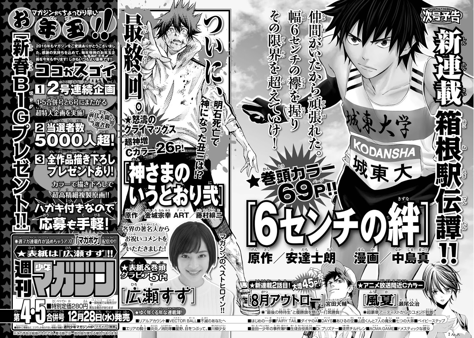 Na porta do bottom/décima quinta colocação aparece Kamisama no Iuutori Ni, que teve seu penúltimo capítulo publicado nessa TOC. O último capítulo será publicado na edição #04/05 e ganhará uma página colorida como sinal de despedida. A obra tinha um bom desempenho nas vendas de volumes (média de 150 mil cópias vendidas por volume). O fim da obra é natural, ou seja, Iutoori Ni não corria riscos de cancelamento. O fim de Kamisama no Iutoori Ni não chega a ser um péssimo sinal para a revista, mas a Shonen Magazine precisará repor o bom nível de vendas da continuação de Iutoori Ni com algum mangá novato que consiga vender em torno de uma média de 150 mil cópias por volume.