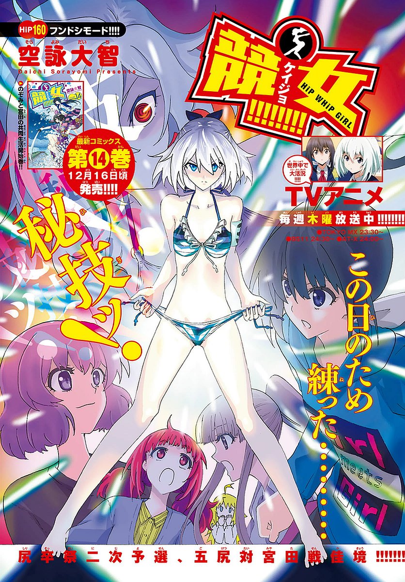 As demais páginas coloridas foram para obras mais veteranas: Kyoukai no Rinne e Keijo!!!!!!!!. Kyoukai segue com uma boa popularidade através de seu anime (que vai ganhar terceira temporada), ainda que o mangá, por sua vez, não venda tanto. Já Keijo!!!!!!!! não alcança melhores resultados por meio do anime, o que faz com que a obra comece a ficar à beira do “limbo do esquecimento” da Shonen Sunday. Assim como na Shonen Jump, o limbo do esquecimento também é de deixar os mangás pra escanteio e raramente conceder privilégios ou posições altas (Denpa Kyoushi perdeu espaço caindo nesse limbo). A diferença é que a liberdade dos autores para finalizar a obra é maior.