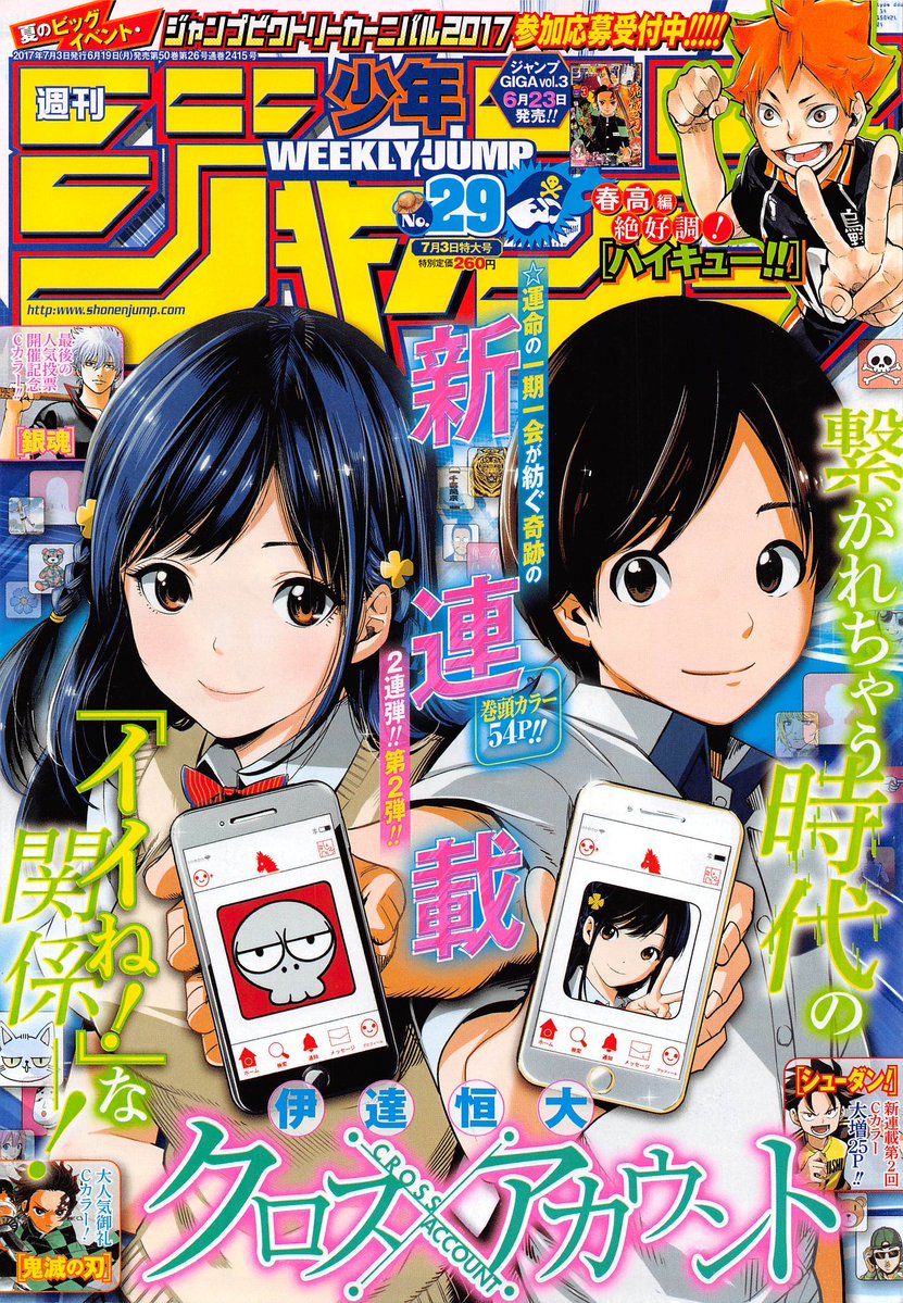 Weekly Shonen Jump #29 (19/06/2017) Cross Account (Capa,Página Colorida de Abertura,Nova Série de Date Tsunehiro – Desenhista de TWB -) 01 – Black Clover c114 02 – One Piece c869 Gintama c637 (Página Colorida) 03 – Haikyuu!! c258 04 – Boku no Hero Academia c141 Shuudan! c2 (Página Colorida) 05 – Yakusoku no Neverland c43 06 – Yuragi-sou no Yuuna-san c67 Kimetsu no Yaiba c66 (Página Colorida) 07 – Dr. Stone c15 08 – Saiki Kusuo no Sainan c248 09 – Hinomaru Zumou c149 10 – Shokugeki no Souma c219 11 – Boku-tachi wa Benkyou ga Dekinai c19 12 – Spring Weapon No. 1 c33 13 – Robot×Laserbeam c13 14 – Harapeko no Marie c16 15 – Poro no Ryuugaku-ki c17 (FIM) Isobe Isobee Monogatari ~Ukiyo wa Tsurai yo~ c241 Ausentes: Boruto: Naruto Next Generations c14, World Trigger c165 (Hiatos) e Hunter x Hunter c361 (Retorna na Próxima Edição)
