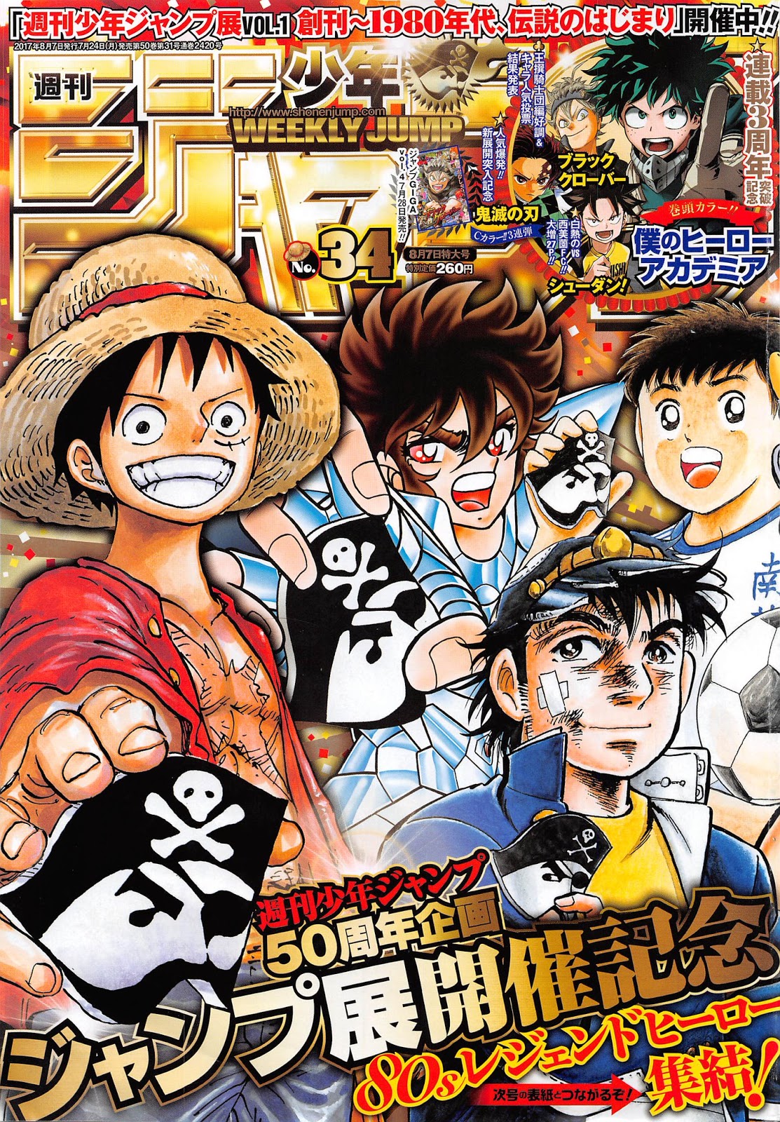 TOC Weekly Shonen Jump #34 (24/07/2017) Capa: Otoko Ippiki Gaki Daishou, Captain Tsubasa, Saint Seiya, One Piece Boku no Hero Academia c146 (Página Colorida de Abertura, Terceiro Aniversário) 01 – Yakusoku no Neverland c48 02 – One Piece c873 Kimetsu no Yaiba c71 (Página Colorida) 03 – Dr. Stone c20 04 – Robot×Laserbeam c18 Shuudan! c07 (Página Colorida) 05 – Hunter×Hunter c365 06 – Saiki Kusuo no Sainan c253 Black Clover c118 (Página Colorida, Resultado da Pesquisa de Popularidade) 07 – Shokugeki no Soma c224 08 – Yuragi-sou no Yuuna-san c72 09 – Boku-tachi wa Benkyou ga Dekinai c24 10 – Haikyuu!! c263 11 – Hinomaru Zumou c154 Cross Account (Capítulo 06) 12 – Spring Weapon Number One c37 13 – Gintama c642 14 – Harapeko no Marie c21 Isobe Isobee Monogatari c246