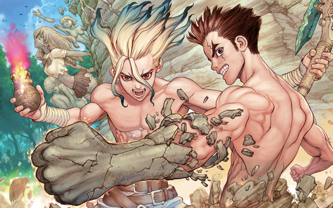 Dr.Stone conta a história de dois adolescentes que viviam suas vidas colegiais “normais” (não podemos considerar a vida de Senkuu, o segundo protagonista, tão normal assim), quando do nada, todas as criaturas vivas na terra (pássaros, seres humanos, ursos, gatos e ecc) se tornam pedra, incluindo os dois heróis da história. É como toda a sociedade tivesse se tornado uma estátua. Milhares de anos se passam, e nossos heróis conseguiram se liberar da petrificação. Contudo, logo perceberam que foram os únicos a conseguirem realizar tal feito, e todos os outros seres humanos ainda estão paralisados e cobertos de pedra. Agora, sozinho eles terão que encontrar um modo de reconstruir a humanidade e livrar os seus companheiros de espécie dessa “maldição”. O ritmo da série é bem rápido, e mesmo os primeiros capítulos não convencendo, após o capítulo 20 a série simplesmente melhorou absurdamente de qualidade (e continua a melhorar). Deste modo Dr.Stone conseguiu garantir uma vaga no TOP 30 de 2017.