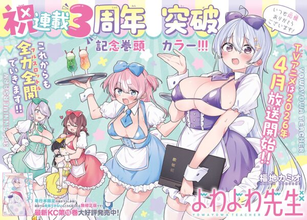 As primeiras páginas coloridas da edição 52 vão para Yowayowa Sensei que celebra três anos de série e traz comentários dos dubladores do anime, hypando o anime que chega em Abril de 2026.