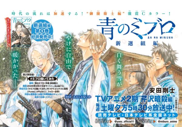 Ao no Miburo: Promovendo volume novo e o anime. Estão destacando que um dos momentos mais adorados pelos leitores do mangá está chegando no anime, então para não perderem.