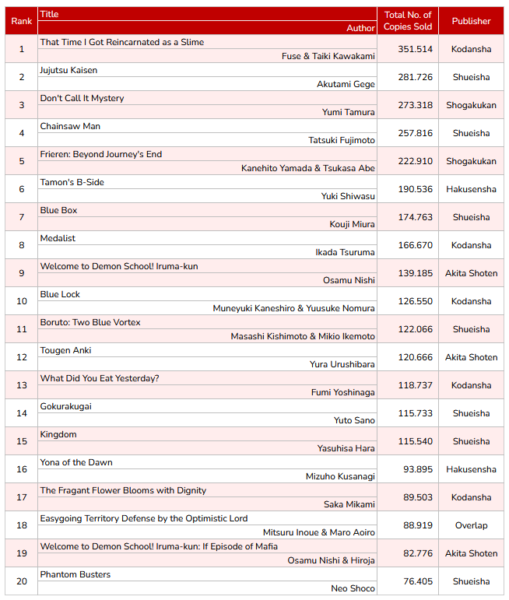Os alarmes são óbvios para qualquer um que acompanha vendas de mangá, mas está claro que os leitores não estão migrando em massa dos super hits do final da década passada para novas obras. Os números que séries como Kimetsu no Yaiba, Jujutsu Kaisen e Tokyo Revengers conquistaram foram absurdos para níveis históricos: só para dar um exemplo, Kimetsu no Yaiba em 2020 vendeu 85 milhões de cópias, batendo o recorde anterior de One Piece em 2011, quando vendeu 38 milhões — mais que o dobro!