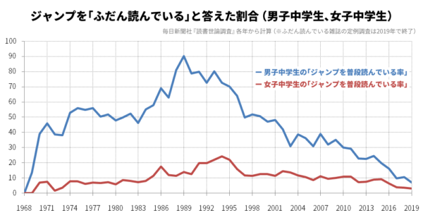 Antigamente, os anime duravam menos e existia uma transição maior do público de uma série para outra, mais similar a como as próprias revistas faziam. Essa cultura mesmo pode ter diminuído pela redução dos leitores delas, com a Jump atual tendo por volta de 1 milhão de cópias em circulação, menos de 1/6 do seu auge nos anos 1990.